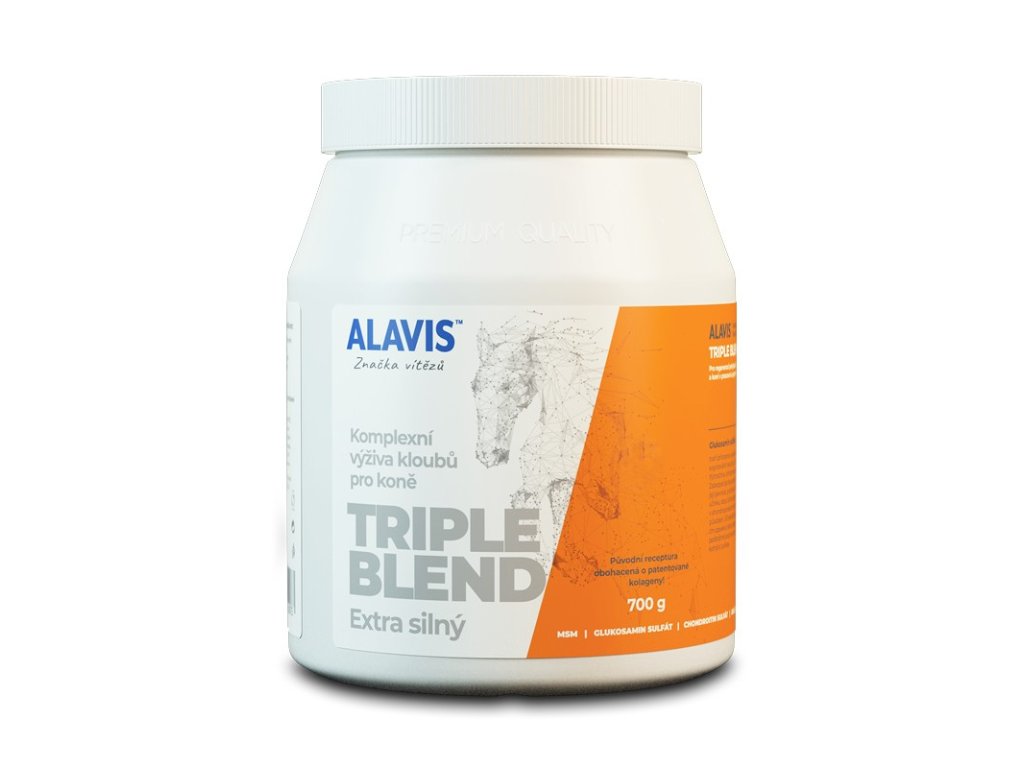 Komplexná kĺbová výživa ALAVIS™ Triple Blend Extra Silný je vhodná na regeneráciu pohybového aparátu, najmä pri preventívnom podávaní u žriebät a koní v pracovnej a športovej záťaži. Obsahuje látky schopné viazať vodu, účinné pri tvorbe kolagénu, podporuje odolnosť v ťahu a spevnenie pohybového aparátu a zvýšenie odolnosti v tlaku. Pomáha pri odstránení bolestí svalov, svalových kŕčov a bolestí šliach.
