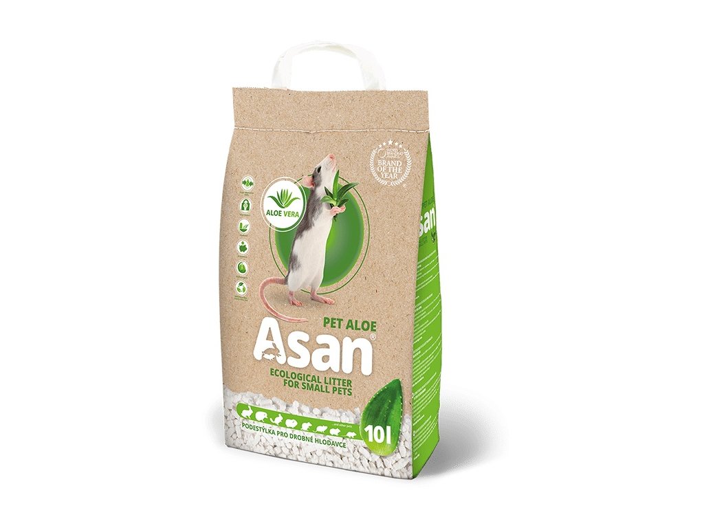 Asan Pet Aloe je podstielka v bio kvalite určená pre zakrpatené králiky, morčatá, činčily a drobné hlodavce. Efektívne absorbuje pachy a vlhkosť a je bezprašná. Vzniká recykláciou, je 100% rozložiteľná, kompostovateľná a je možné spláchnuť do toalety. Obsahuje extrakt z aloe vera, ktorý zvlhčuje kožu a hojí prípadné odreniny Asan Pet sa osvedčil v chovoch exotického vtáctva av použití pre niektoré druhy terárijných zvierat.