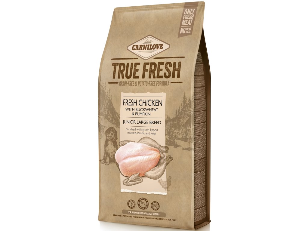Carnilove True Fresh – Čerstvé kura s pohánkou a tekvicou. Obohatené o slávku zelenoústou, žaburinka a morské riasy. Pre mladých psov veľkých plemien. Receptúra s čerstvým mäsom bez obilnín a zemiakov. Kompletné krmivo pre psov. Vyrobené iba z čerstvého mäsa, bez použitia mäsových múčok. Prirodzená forma výživy s vynikajúcou chutnosťou a vysokou stráviteľnosťou. Chondroprotektory na podporu zdravého vývoja pohybového aparátu. Omega mastné kyseliny na udržanie správneho vývoja centrálnej nervovej sústavy. Receptúra obsahuje vysoký podiel čerstvého kuracieho z fariem a lokálnych zdrojov. Vysoko kvalitné bielkoviny pomáhajú udržiavať silné a štíhle svaly, zatiaľ čo vaječné škrupiny a slávka zelenoústá podporujú správny vývoj zubov, kĺbov a kostí. Pohánka je zdrojom lysinu, ktorý je nevyhnutný pre rast a regeneráciu tkanív, a podporuje aj vstrebávanie vápnika, čo je dôležité pre šteňatá veľkých plemien. Okrem toho sú pohánka a šošovka prirodzeným zdrojom rastlinných bielkovín a minerálnych látok potrebných pre zdravý metabolizmus a pomáhajú tiež udržiavať optimálnu telesnú hmotnosť. Losový olej má protizápalové a pozitívne účinky na srsť a kožu vášho psa a potenciálne znižuje vznik kožných alergií.Dodatočné parametre
