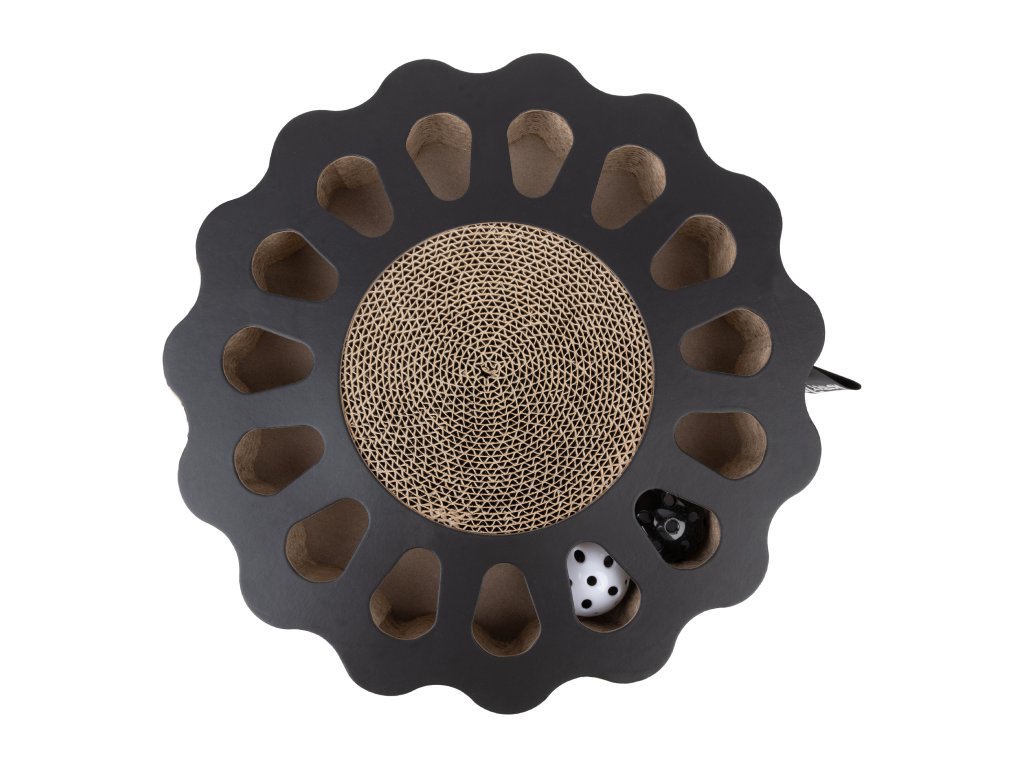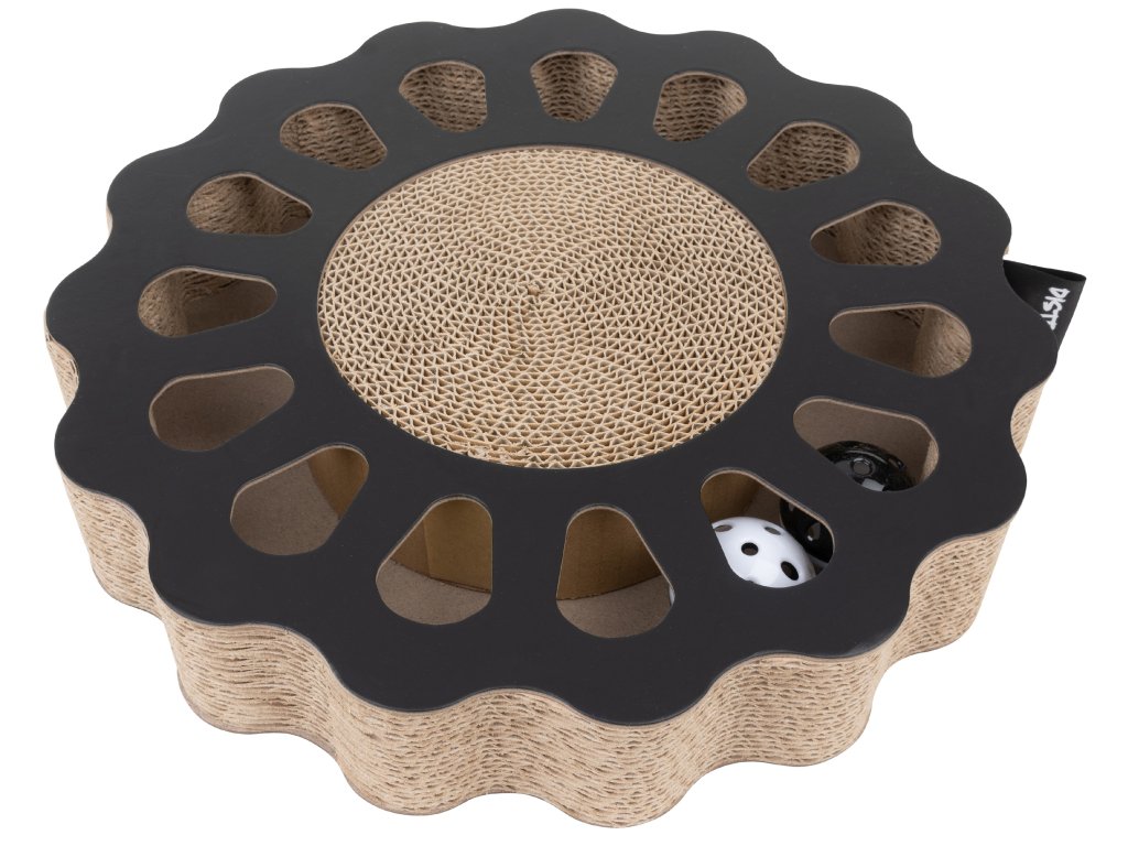 Väčšina mačiek sú so slnkom nerozlučná dvojka as touto zábavnou škrabacou hračkou SUNNY tomu nebude inak. Vďaka kartónovému povrchu je atraktívnym miestom na prižmúrenie očí a krátkym odpočinkom medzi hraním. Po zaslúženom spánku môže vaša mačka pokračovať v snahe chytiť dve cinkajúce loptičky jedným z pätnástich otvorov v dráhe. Kruh na škrabanie je v praktickej základnej farbe, takže je vhodný do každého interiéru. Mačky sú stále častejšie chované doma, ale stále si zachovávajú svoje prirodzené inštinkty. Doska na škrabanie so zabudovanou dráhou s loptičkami, je ideálna pre každú mačku, ale najmä pre mačky žijúce vo vnútri. Hračka na škrabanie SUNNY podporuje hravý poľovný inštinkt mačky, podporuje obratnosť a povzbudzuje k pohybu. Dôvody, prečo si ju zamilovať: Multifunkčná škrabacia hračka v tvare slnka. 360 stupňov zábavy, ktorá prebudí mačiatko v každej mačke. Obsahuje dve cinkajúce loptičky, ktoré podnietia vašu mačku na hranie. Škrabadlo udržuje pazúriky v dobrej kondícii a zároveň škrabaním pomáha mačke proti stresu. Ideálny darček pre každú mačku. Rozmery: 32 x 32 x 6 cm. Farba: čierna.