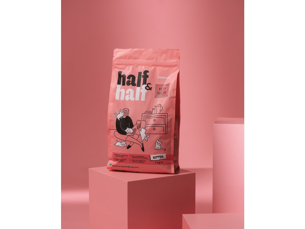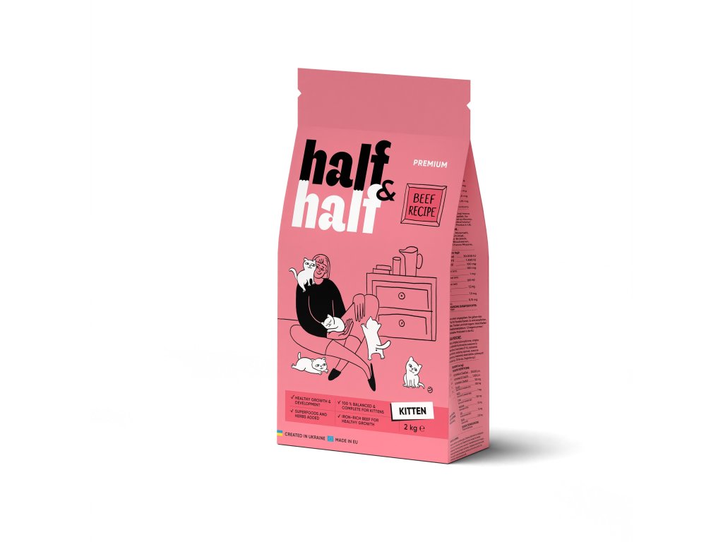 Kompletné suché krmivo pre mačiatka všetkých plemien do 1 roku. Toto krmivo poskytne vášmu zvieraťu potrebné živiny pre zdravý rast a vývoj vo všetkých fázach rastu. Nájdete v ňom hovädzie mäso bohaté na železo, ktoré je optimálnou bielkovinou pre plný a rovnomerný nárast svalovej hmoty a ktoré podporuje hladinu hemoglobínu v krvi. Receptúra Half&Half je obohatená o ovocie, zeleninu, chondroprotektíva a liečivé rastliny. Otruby sú nielen bohaté na vitamíny skupiny B, ale taktiež zlepšujú trávenie, črevnú peristaltiku a pomáhajú vylučovať toxíny z tela. Chondroprotektíva glukosamín a chondroitín sulfát pomáhajú posilňovať a podporovať zdravú tvorbu kĺbov a chrupaviek. Zmes liečivých rastlín sa pre zmenu stará o silnú imunitu zvieraťa.