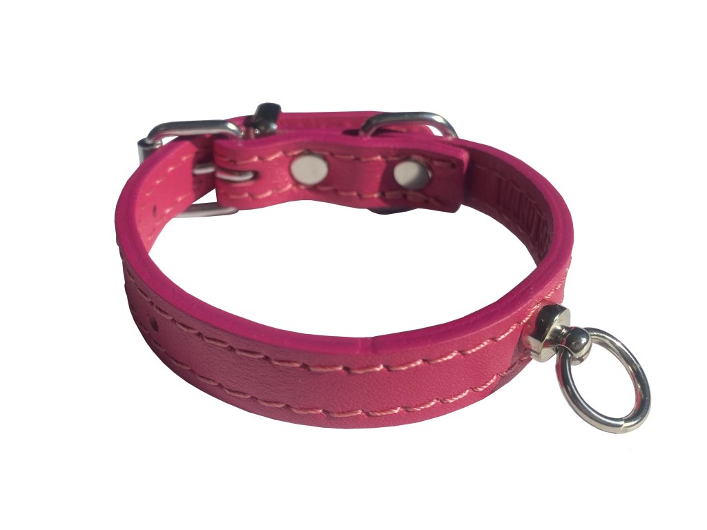 Obojok z talianskej vrchovej farbenej hovädzej kože. Kovová spona. Krúžok s držiakom na psie známky. Prešívanie po celej dĺžke obojku. Podšívka z hovädzej kože ako je vo farbe lícovej strany. Vyrobené v Českej republike. K dispozícii sú štyri veľkosti. Rozmer: XS 14mm x 16-22cm. Farba: ružová.