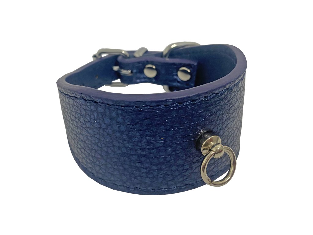 Obojok z talianskej vrchovej vyčinenej hovädzej kože s metalickým efektom. Špeciálne navrhnutý pre chrty. Kovová spona. Krúžok na psiu známku. Prešívanie po celej dĺžke obojku. Podšívka z vrchovej hovädzej kože do farby lícovej strany - metalu. Vyrobené v Českej republike. K dispozícii je päť veľkostí. Rozmer: XS 40mm x 21-26cm. Farba: modrá
