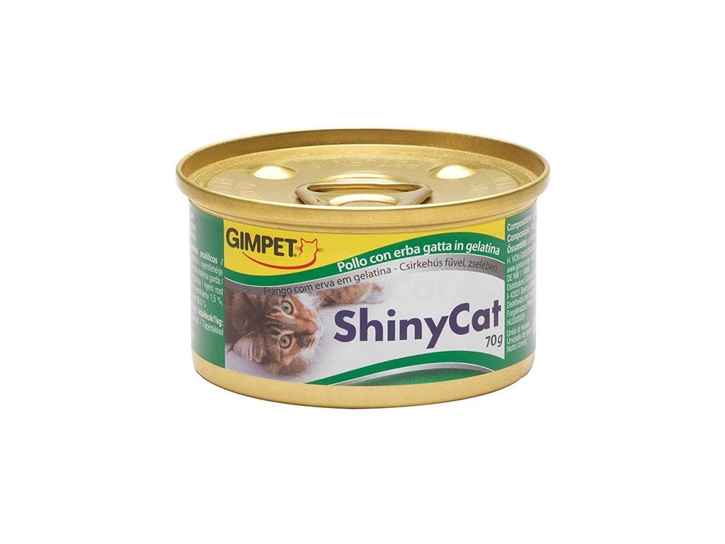 ShinyCat konzerva kura sú lahôdkové a čisto mäsové konzervy iba prírodné s kuracím mäsom 38,6% pre dospelé mačky. V konzerve je vidieť najemno nakrájané kuracie mäso, bez umelých prísad a konzervačných látok, sú to obzvlášť chutné kúsky v želé, ktoré sú veľmi jemné a šťavnaté. Vďaka veľkému obsahu proteínov podporíte zdravie a imunitný systém vašej mačky. Kurčatá z kontrolovaných chovov bez použitia hormónov ponúkajú kvalitu, ktorá jednoducho chutí. Pretože krmivo obsahuje iba 1% tuku, je vhodné aj pre mačky, ktoré trpia nadváhou. Obsah konzervy 70 g.